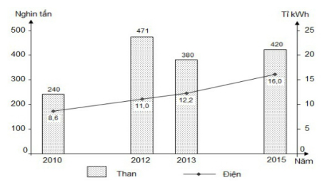 Câu 37: Cho biểu đồ về than và điện của Mi-an-ma, giai đoạn 2010 - 2015
