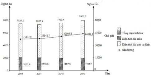 Câu 30: Cho biểu đồ về tình hình sản xuất lúa của nước ta giai đoạn 2005 – 2013