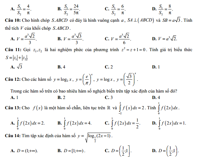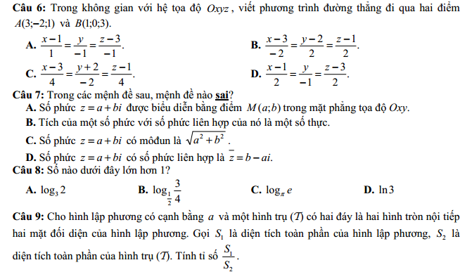 Câu 9:Cho hình lập phương cá cạnh bằng a và một hình trụ (T) có hai đáy là hai hình tròn nội tiếp hai mặt đối diện của hình lập phương. Gọi