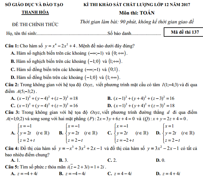 Đề thi khảo sát chất lượng môn toán năm 2017- Sở giáo dục đào tạo Thanh Hóa
