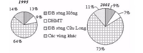 Căn cứ vào biểu đồ, hãy cho biết nhận xét nào sau đây đúng về sự thay đổi cơ cấu diện tích nuôi trồng thuỷ, hải sản của nước ta phân theo các vùng năm 1995 và 2001?