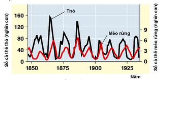 Câu 8: Đồ thị dưới đây biểu diễn biến động số lượng thỏ và mèo rừng ở Canađa, nhận định nào không đúng về mối quan hệ giữa hai quần thể này?
