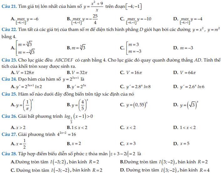 Câu 23: Cho hình lục giác đều ABCDEF có cạnh bằng 4. Cho lục giác đó quay quanh đường thẳng AD. Tính thể tích của khối tròn xoay được sinh ra.