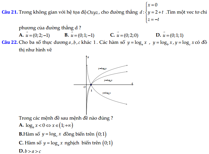 Câu 22: Cho ba số dương a, b, c khác 1. Các hàm số