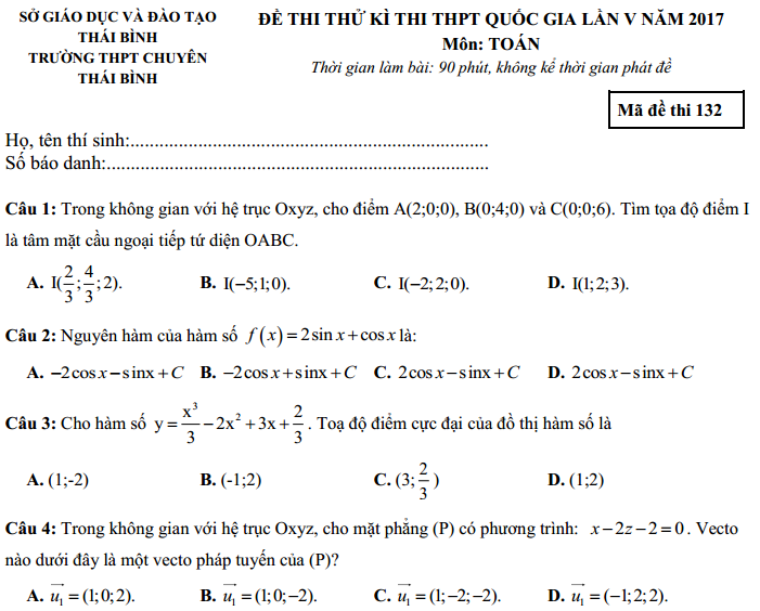 Đề thi thử THPT quốc gia môn toán năm 2017 của trường THPT chuyên Thái Bình lần 5
