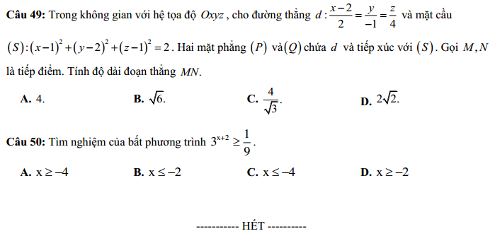 - Đề thi và đáp án môn Toán: Mã đề 109