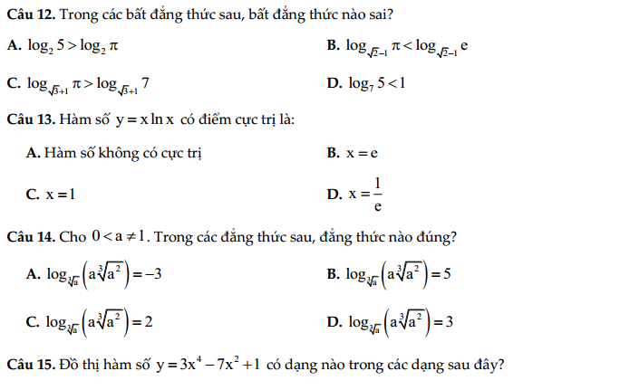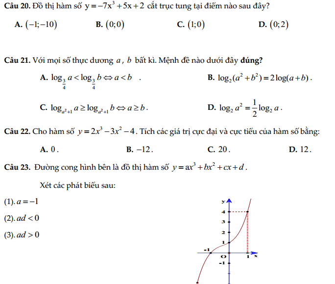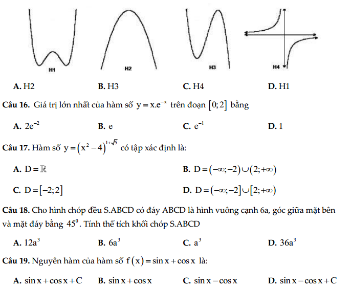 Câu 1: Đường cong trong hình bên là đồ thị của một hàm số trong bốn hàm số được liệt kê ở bốn phương án A, B, C, D dưới đây. Hỏi hàm số đó là hàm số nào?