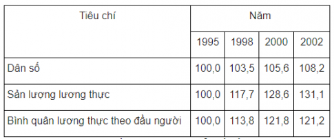 Câu 38: Dựa vào bảng số liệu so sánh sản lượng lương thực và dân số năm 2000 với năm 2002 cho thấy.