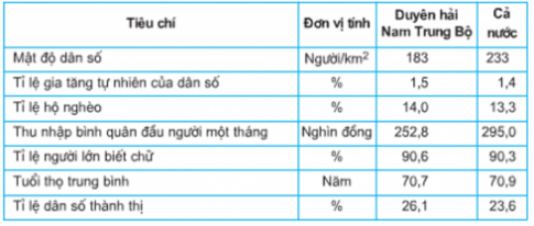 Tiêu chí về dân cư, xã hội ở vùng Duyên hải Nam Trung Bộ thấp hơn mức trung bình cả nước là: