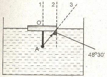 Câu 34: Người ta thả một nút bấc mỏng hình tròn nổi trên mặt thoáng một chậu đựng nước bằng nhựa. Ngay ở tâm O của nút ấy ta cắm một chiếc dinh ngắn OA theo chiều thẳng đứng, đàu A ở dưới nước. Hỏi mắt đặt tại vị trí nào trên hình vẽ để nhìn thấy chiếc đinh?