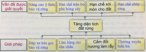 2. Dựa trên các vấn đề đã phân tích ở bài tập 1, hãy đề xuất các giải pháp để làm tăng diện tích đất rừng và bảo vệ rừng ở khu vực này. Diện tích rừng được mở rộng, các vấn đề gì tại địa phương sẽ được giải quyết? Điền vào sơ đồ sau: