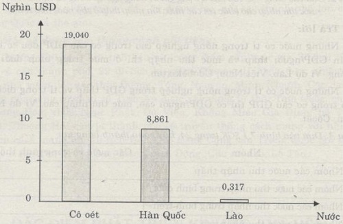 Câu 2: Dựa vào bảng 7.2 SGK – trang 22, em hãy vẽ biểu đồ hình cột để so sánh mức thu nhập bình quân đầu người (GDP/người) của các nước Cô-oét, Hàn Quốc, Lào năm 2001.