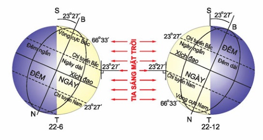 - Vào ngày 22-12 (đông chí) ánh sáng Mặt trời chiếu thẳng vào mặt đất ở vĩ tuyến 23o27′ Nam, trên đường chí tuyến Nam.