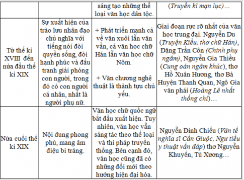 Câu 2: (Trang 112 - SGK Ngữ văn 10 tập 1) Dựa vào kiến thức được trình bày trong mục II, lập bảng tổng kết về tình hình phát triển của văn học Việt Nam thời trung đại theo mẫu sau: