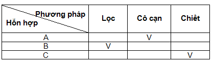 Cho các hỗn hợp: Hỗn hợp A gồm muối ăn và nước; Hỗn hợp B gồm cát và nước; Hỗn hợp C gồm dầu ăn và nước.