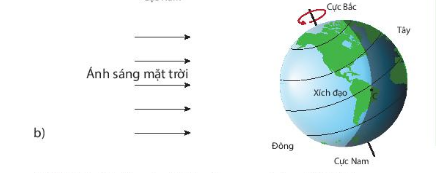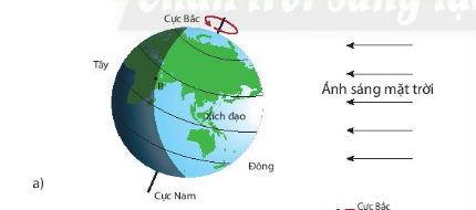 - Trái đất tự quay quanh trục của nó theo chiều ngược chiều kim đồng hồ, từ phía tây sang phía đông. Mỗi thời điểm, ánh sáng mặt trời chiếu tới trái đất sẽ làm một nửa diện tích trái đất được chiếu sáng