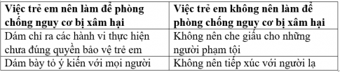 Em hãy tìm hiểu và trang bị cho bản thân các kiến thức và kĩ năng phòng, chống xâm hại trẻ em. Ghi lại những việc trẻ em nên làm để phòng chống nguy cơ xâm hại trẻ em theo bảng sau: