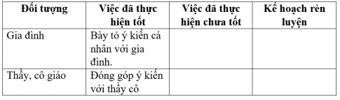- Em hãy tự nhận xét việc thực hiện bổn phận của mình đối với gia đình, thầy cô giáo. Đều gì em đã thực hiện tốt? Hãy xây dựng kế hoạch rèn luyện để khắc phục những điều chưa tốt theo bảng mẫu?