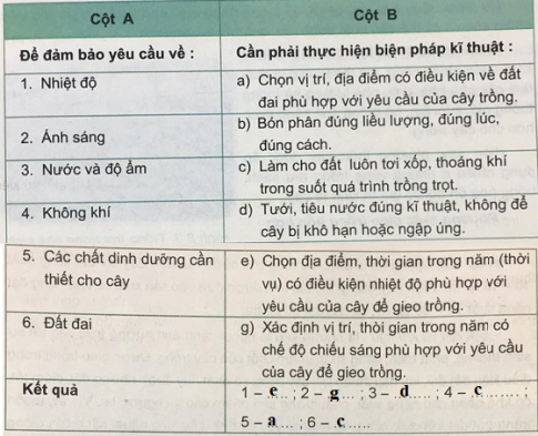 Ghép một cụm từ ở cột A với một cụm từ ở cột B để được các câu đúng về biện pháp kĩ thuật trong trồng trọt