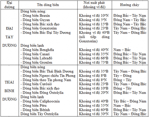 | Thái Bình Dương | Dòng biễn nóng......................... ............................................... Dòng biển lạnh.......................... ............................................... | .............................................. ............................................... ............................................... ............................................... | .............................................. ............................................... ............................................... ............................................... |