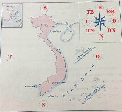 EM hãy điền các hướng: Bắc (B), Nam (N), Đông (Đ), Tây (T), Đông Bắc (Đb), Đông Nam (ĐN), Tây Bắc (TB), Tây Nam (TN) vào trong các vòng tròn trong bình vẽ và bốn hướng vào bản đồ Việt Nam ở hình 1 trang 7