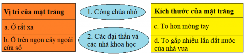 6. Cách nghĩ của công chúa về vị trí và kích thước của mặt trăng khác với các nhà khoa học và các đại thần như thế nào? Chọn ô ở giữa phù hợp với từng ô ở cột trái, phải để trả lời: