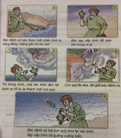 5. Mỗi em dựa vào tranh để tập kể 1 đoạn của câu chuyện Bác đánh cá và gã hung thần.