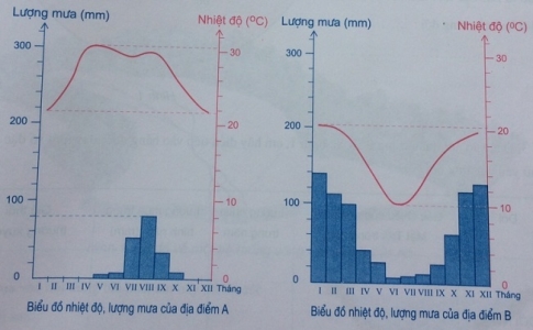 Quan sát biểu đồ thể hiện nhiệt độ, lượng mưa của địa điểm A, B và trả lời các câu hỏi sau: