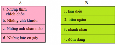 b. Chọn những từ ngữ ở cột A thích hợp với từ ngữ ở cột B để tạo thành các câu nói về vẻ riêng của mỗi loài chim: