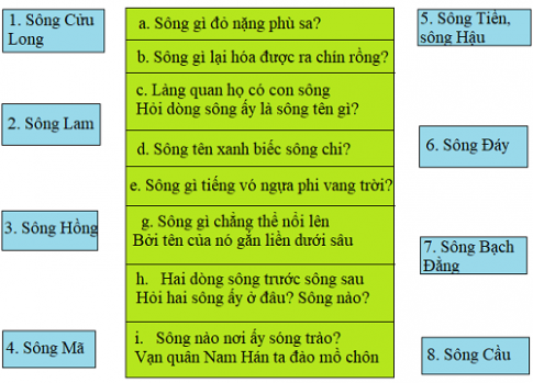 Hai đội chơi. Mỗi đội có 8 thẻ từ ghi trên sông. Đội nào ghép đúng trên sông để giải câu đố xong trước khi thắng cuộc
