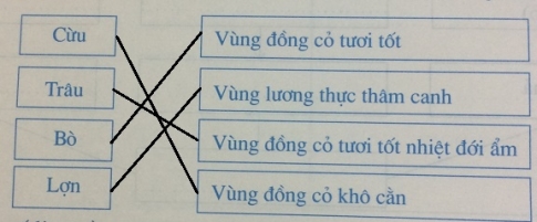 Dựa vào các kiến thức đã học, em hãy ghép tên các vật nuôi vào các vùng chăn nuôi tương ứng: