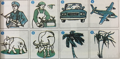 2. Nhìn tranh, viết vào vở những từ ngữ chỉ người, đồ vật, con vật và cây cối trong tranh (theo số thứ tự)