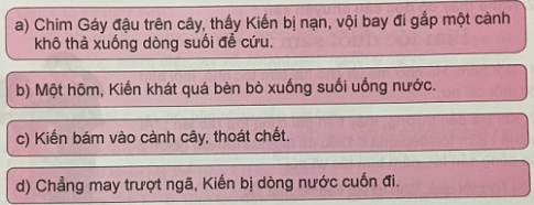 6. Xếp câu: Đến góc học tập lấy bộ thẻ chữ gồm 4 câu trong truyện Kiến và Chim Gáy (như dưới đây) để sắp xếp các câu cho đúng thứ tự