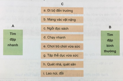 b. Ghép chữ cái (a, b, ........i) trong ô chữ ở cột C phù hợp với trạng thái của tim ở cột A hoặc cột B?