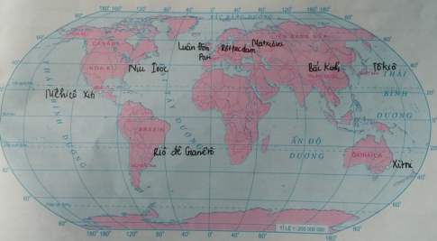 Xác định và ghi vào trên lược đồ dưới đây những đầu mối giao thông quan trọng sau: Niu Iooc, Mêhicô Xiti, Riô đê Gianêrô, Luân Đôn, Pari, Rôttecđam, Tôkiô, Bắc Kinh, Matxcơva, Xitni.