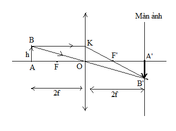 a) Dựa vào cách dựng ảnh của một vật qua thấu kính hội tụ, hãy chứng minh rằng: Nếu ta đặt một vật AB có độ cao là h vuông góc với trục chính của một thấu kính hội tụ và cách thấu kính một khoảng bằng 2 lần tiêu cự (OA = 2f) thì ta sẽ thu được một ảnh ngược chiều, cao bằng vật (A'B' = h' = h = AB) và cũng nằm cách thấu kính khoảng 2f.