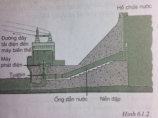 Trên hình 61.2 SGK vẽ các bộ phận chính của một nhà máy thủy điện. Hãy cho biết năng lượng của nước trong hồ chứa đã biến đổi từ dạng nào sang dạng nào qua các bộ phận: ống dẫn nước, tuabin, máy phát điện.