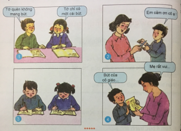 2. Dựa vào tranh vẽ, kể lại câu chuyện có tên Bút của cô giáo