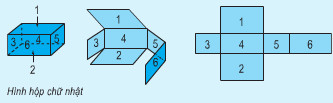 - Hình hộp chữ nhật có 6 mặt (như hình vẽ): hai mặt đáy (mặt 1 và mặt 2) và bốn mặt bên (mặt 3,mặt 4, mặt 5 và mặt 6) đều là hình chữ nhật. Mặt 1 và mặt 2; mặt 3 và mặt 5; mặt 4 và mặt 6.