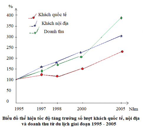 - Vẽ biểu đồ thể hiện tốc độ tăng trưởng số lượt khách du lịch quốc tế, nội địa và doanh thu từ du lịch trong giai đoạn 1995 – 2005