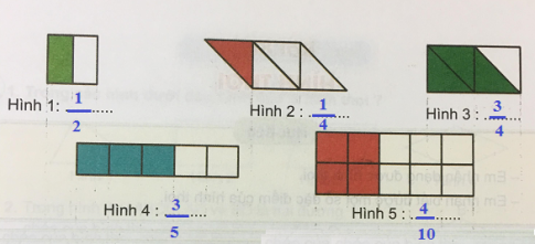 Ví dụ mẫu: Hình 1 có tất cả 2 hình chữ nhật, trong đó có 1 hình được tô màu => Ta có phân số là: ![]()