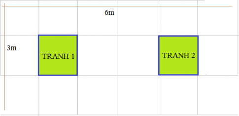 Trên một bức tường hình chữ nhật có chiều dài 6m, chiều rộng 3m, cô giáo muốn treo hai bức ảnh hình vuông có cạnh 1m, cách nhau 2m. Em hãy giúp cô giáo vẽ phác hoạ bức tường và vị trí hai bức tranh sao cho cân đối và đẹp.