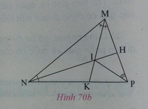 b) Cho tam giác MNP. Vẽ hai đường phân giác MK và NH cắt nhau tại I. Cho góc NMP bằng 70 độ, góc MNP bằng 40 độ (h.70b). Hãy tính số đo góc IPH.