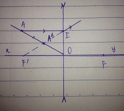 + Từ A vẽ tia AJ // xy cắt thấu kính tại J. Nối JA' kéo dài cắt xy tại F' là tiêu điểm ảnh của thấu kính. Tiêu điểm vật F lấy đốĩ xứng với F' qua quang tâm O.