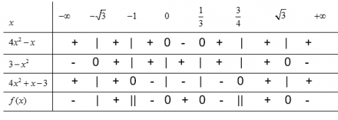 với \(x \in \left( -\sqrt 3; -1 \right) \cup \left( 0; \frac{1}{3} \right) \cup \left( \frac{3}{4}; \sqrt 3 \right)\)