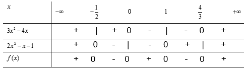 với \(x \in \left( -\infty ;{-{1 \over 2}} \right) \cup (0;1) \cup \left( \frac{4}{3}; + \infty \right)\)
