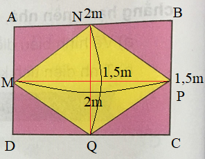 Một chiếc khăn trải bàn hình chữ nhật có chiều dài 2m và chiều rộng 1,5m. Ở giữa khăn người ta thêu họa tiết trang trí hình thoi có các đường chéo bằng chiều dài và chiều rộng hình chữ nhật. Tính diện tích khăn trải bàn và diện tích hình thoi.