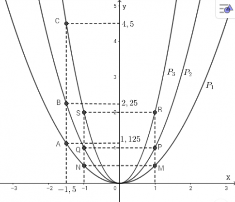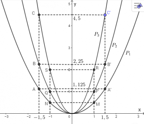 c. Tìm ba điểm A'; B'; C' có cùng hoành độ x = 1,5 theo thứ tự nằm trên ba đồ thị. Kiểm tra tính đối xứng của A và A'; B và B'; C và C'.