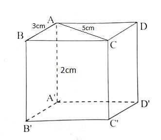 Tính thể tích của hình hộp chữ nhật ABCD.A'B'C'D', biết AB = 3cm, AC = 5cm, AA' = 2cm.
