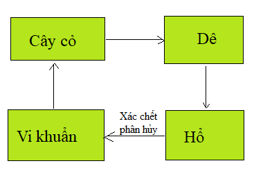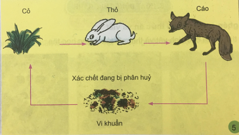 Trong sơ đồ trên, cỏ là thức ăn của thỏ, thỏ là thức ăn của cáo; xác chết của cáo là thức ăn của vi khuẩn, vi khuẩn phân hủy các xác chết tạo thành các chất đơn giản (chất vô cơ) trả lại cho môi trường.